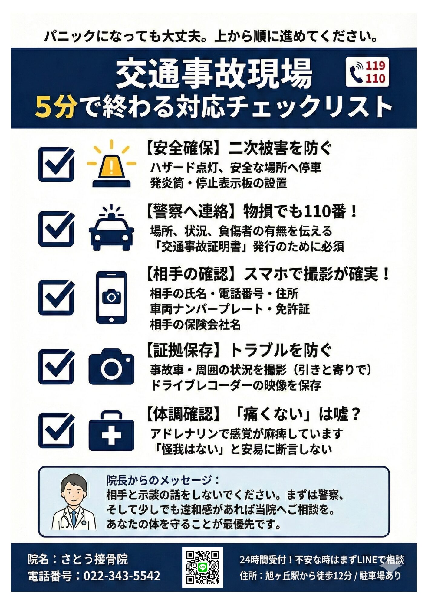 しかし、一番怖いのは「体の異変」を放置することです。事故直後は「物」の心配ばかりしてしまいがちですが、あなたの体は替えがききません。